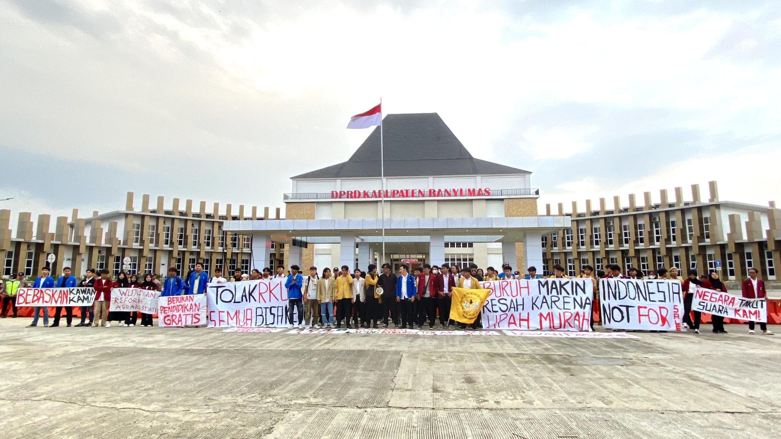 Di depan gedung baru Dewan Perwakilan Rakyat Daerah (DPRD) Kabupaten Banyumas, Kamis (24/7/2025), sejumlah mahasiswa yang tergabung dalam Aliansi Badan Eksekutif Mahasiswa (BEM) Banyumas Raya menggelar aksi mimbar bebas. Bertemakan “Indonesia Makin Gelap, Kembalikan Kedaulatan Rakyat!”, massa lantang menyuarakan penolakan atas deretan kebijakan pemerintah yang dinilai ugal-ugalan dan tidak pro-rakyat, baik di tingkat nasional maupun di tanah Banyumas sendiri.